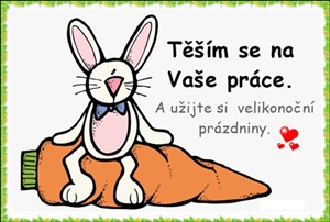 I zde Vám nechávám více volnosti. Zadání úkolu: nakresli obrázek na téma Jaro (nebo Velikonoce), obrázek podepiš, vyfoť a pošli na e-mail z.sikorova@kosmonautu15.cz. Můžete použít i počítač a nakreslit nebo namalovat obrázek pomocí počítače (jen pozor: poslat mi musíš ve formátu pdf nebo jpeg).